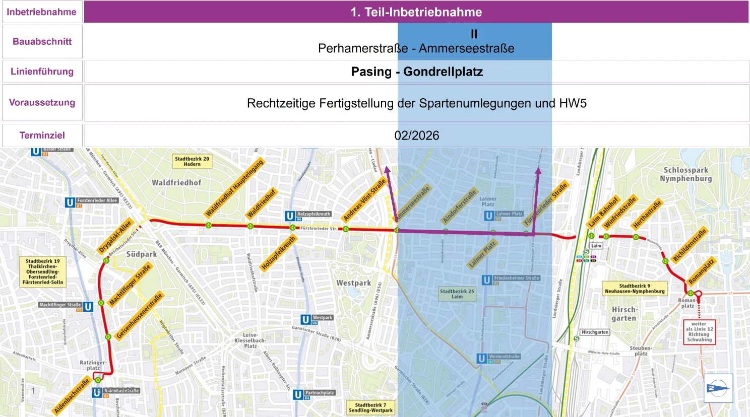 Die ursprünglich für Dezember 2025 geplante Inbetriebnahme des Abschnitts zwischen Agnes-Bernauer-Straße und Ammerseestraße verschiebt sich nach aktuellen Erkenntnissen auf den 27. Februar 2026.